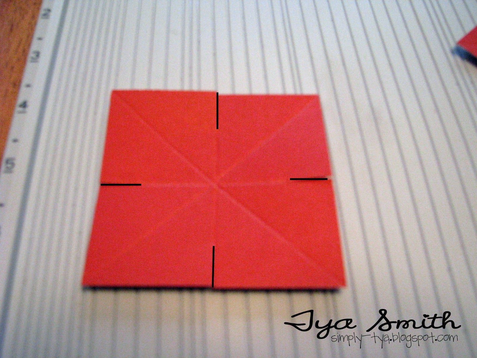 Using the Scor-Pal Tool, fold all score marks until all angles are folded. Turn the paper so it is in a square shape instead of a diamond shape. Pinch the 2 sides into the center as shown.